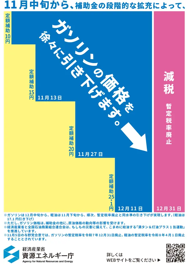 ○ガソリン2025年11月12日まで:10円/L、11月13日~:15円/L、11月27日~:20円/L、12月11日~:25.1円/L
