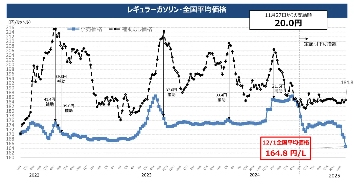 ガソリン1リットルあたり10円を補助する定額支援策です。ガソリンの「当分の間税率」(いわゆる暫定税率)をどうするかについて結論が得られて実施されるまでの間、直近の物価高にすみやかに対応する観点から、今回の措置が実施されることとなりました。
