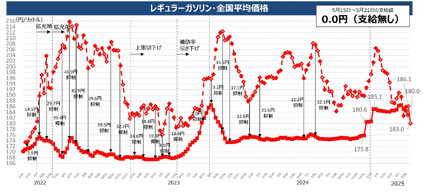 具体的な支給額は基準価格をガソリンの全国平均価格168円とした上で、基準価格から17円を超える分については全額補助とし、17円以下の部分は